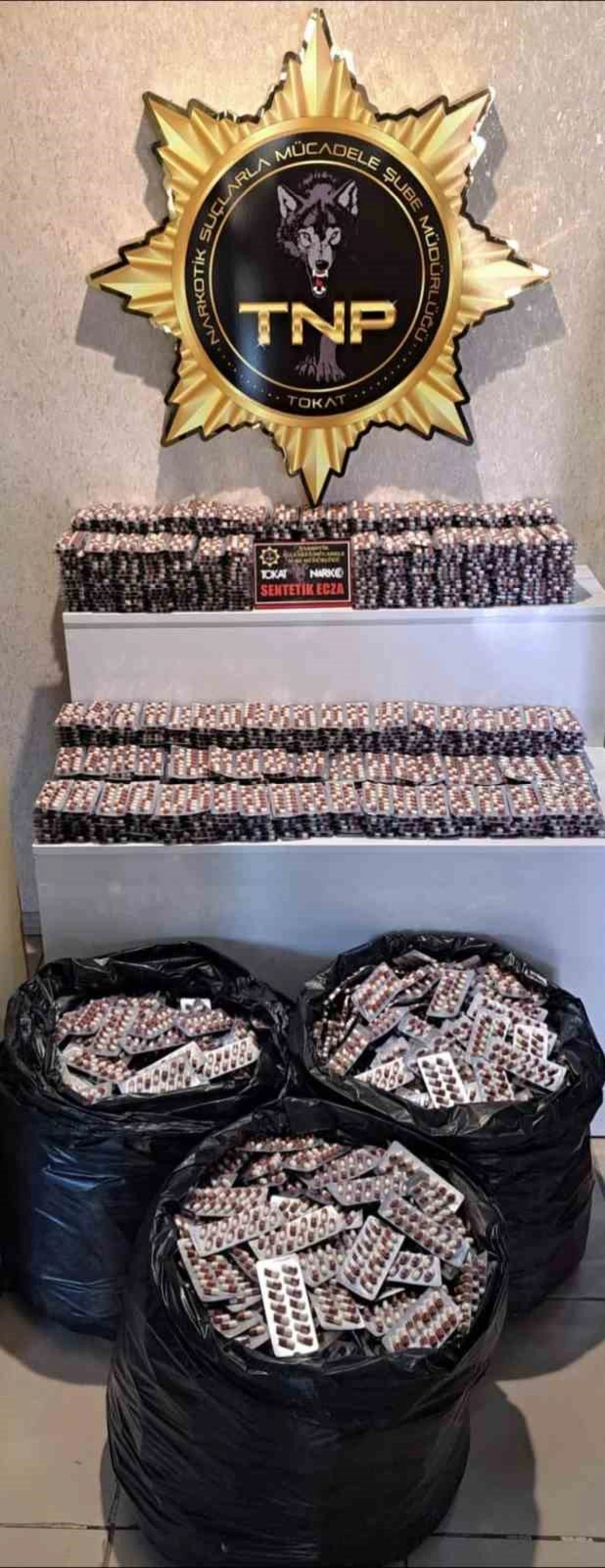 Tokat’ta Narkotik Suçlarla Mücadele ve Asayiş Şube Müdürlüklerince yürütülen koordineli çalışma kapsamında il dışından gelen bir araçta yapılan aramada 55 bin 440 adet sentetik ecza ele geçirildi.