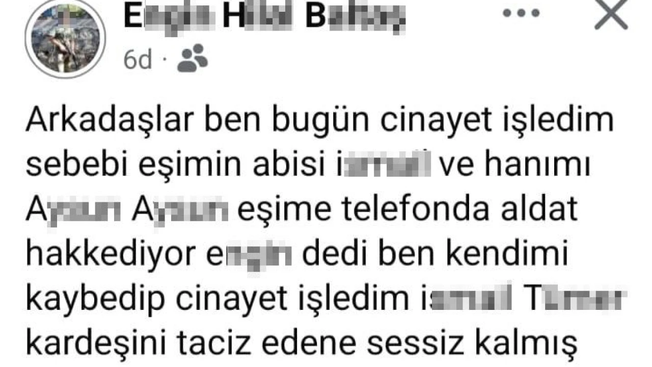 Öte yandan, zanlı Engin B.’nin, cinayetin ardından sosyal medya hesabından paylaşım yaptığı belirlendi. Engin B.’nin, paylaşımında, "Arkadaşlar ben bugün cinayet işledim. Sebebi, eşimin abisi İ. ve hanımı A. eşime telefonda ’Aldat, hak ediyor Engin’ dedi. Ben kendimi kaybedip cinayet işledim. İ.T., kardeşini taciz edene sessiz kalmış" ifadelerini kullandığı görüldü.