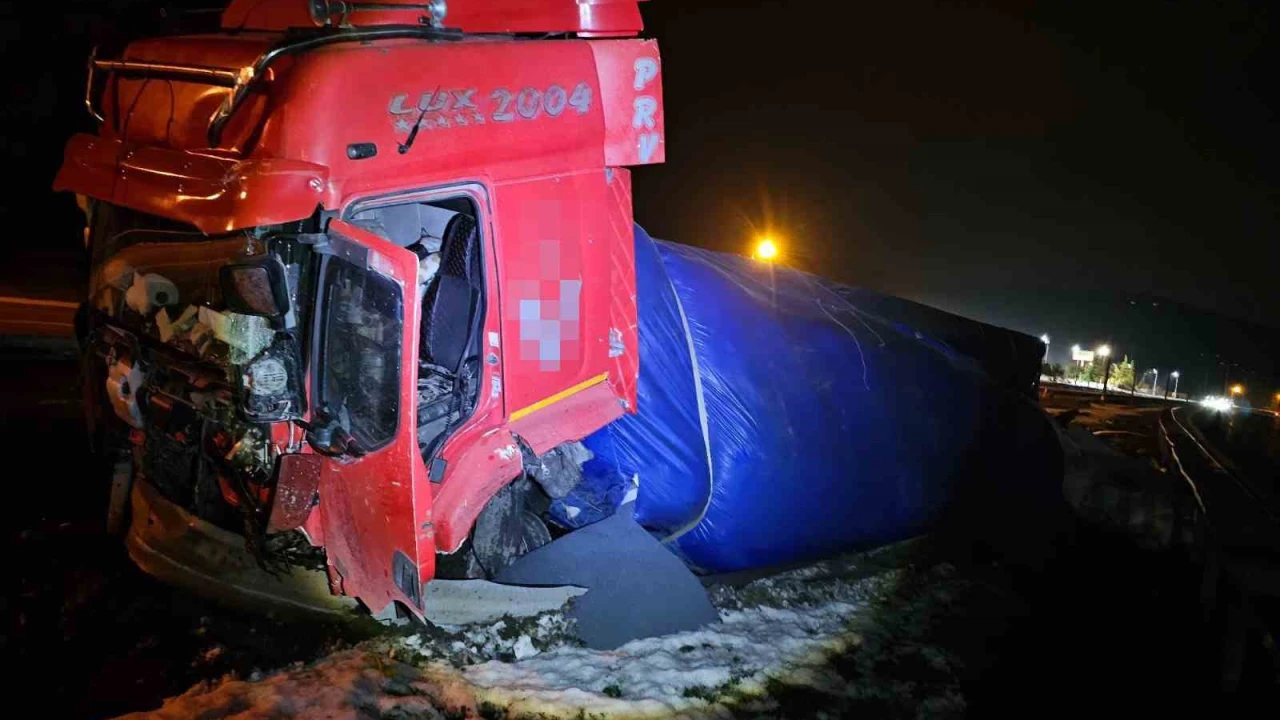 DÜZCE(İHA) – Anadolu Otoyolu Düzce kesiminde gece saatlerinde lastiği patlayan tır bariyere çarparak durdu, kazada şans eseri yaralanan olmadı.