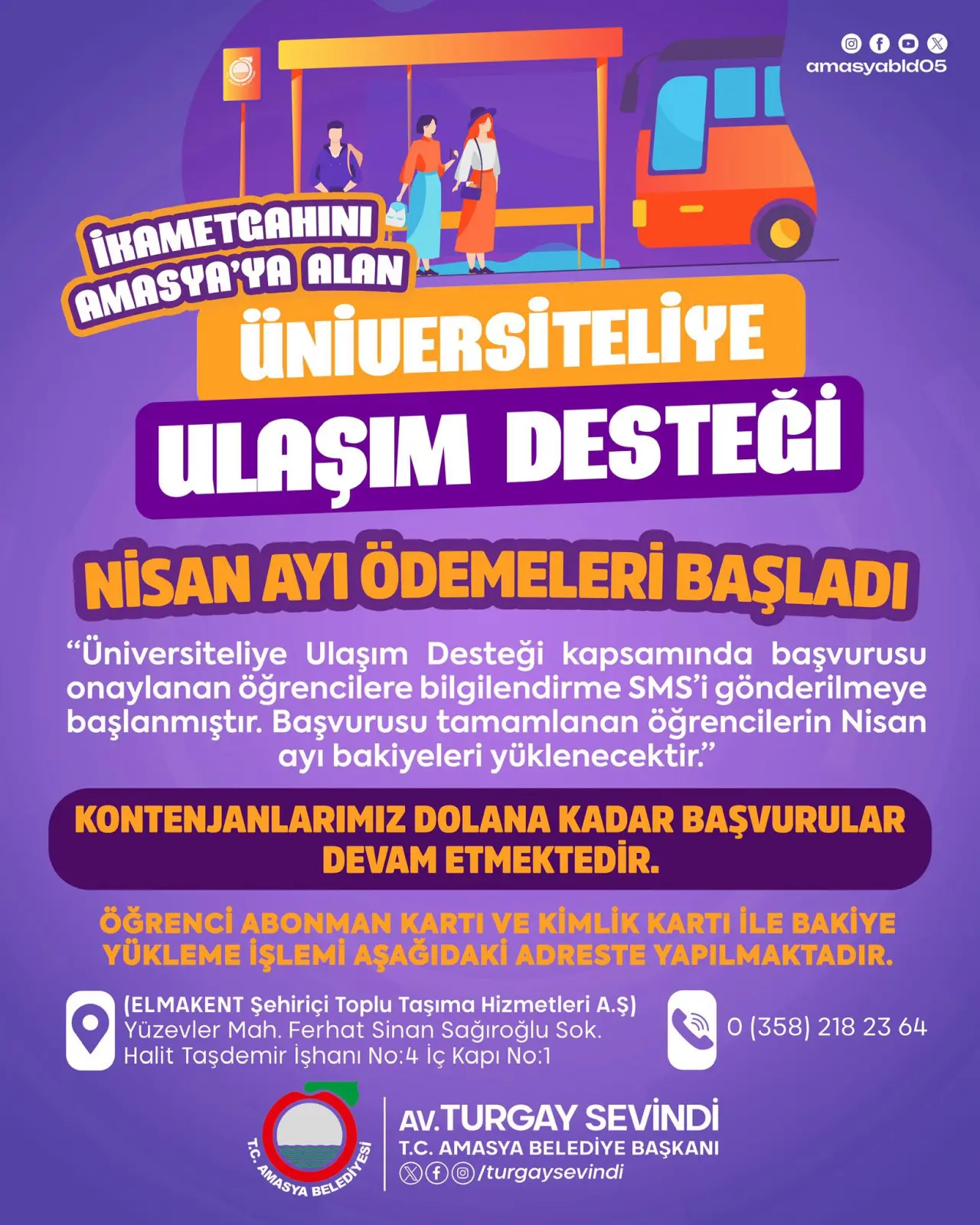 Amasya’da üniversite öğrencilerine yönelik sosyal destek projeleri kapsamında hayata geçirilen ulaşım desteğinde önemli bir gelişme yaşandı. Amasya Belediyesi tarafından yapılan duyuruya göre, “Üniversiteliye Ulaşım Desteği” programı kapsamında Nisan ayı ödemeleri resmen başladı.