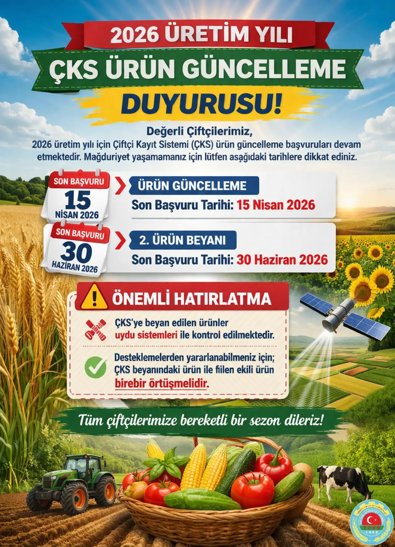 Başkan Aktaş yaptığı açıklamada, ÇKS’nin tarımsal desteklemelerden faydalanabilmek adına büyük önem taşıdığını belirterek, “2026 üretim yılı için ÇKS ürün güncelleme başvurularında son gün 15 Nisan 2026. Tüm çiftçilerimizin işlemlerini bugün mesai bitimine kadar tamamlaması gerekiyor. Aksi halde desteklerden yararlanmaları riske girebilir” dedi.