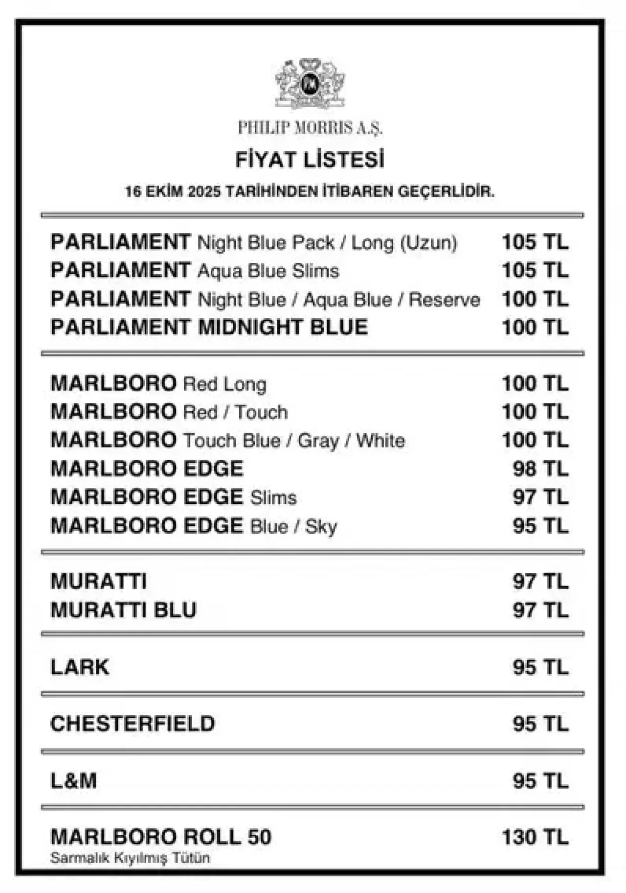 Türkiye tütün pazarının en büyük üreticisi konumundaki Philip Morris, sigara fiyatlarına 5 TL’lik yeni bir zam uyguladı. Bu artışla birlikte markanın ürünleri arasında en ucuz sigara 95 TL, en pahalı sigara ise 105 TL seviyesine çıktı.