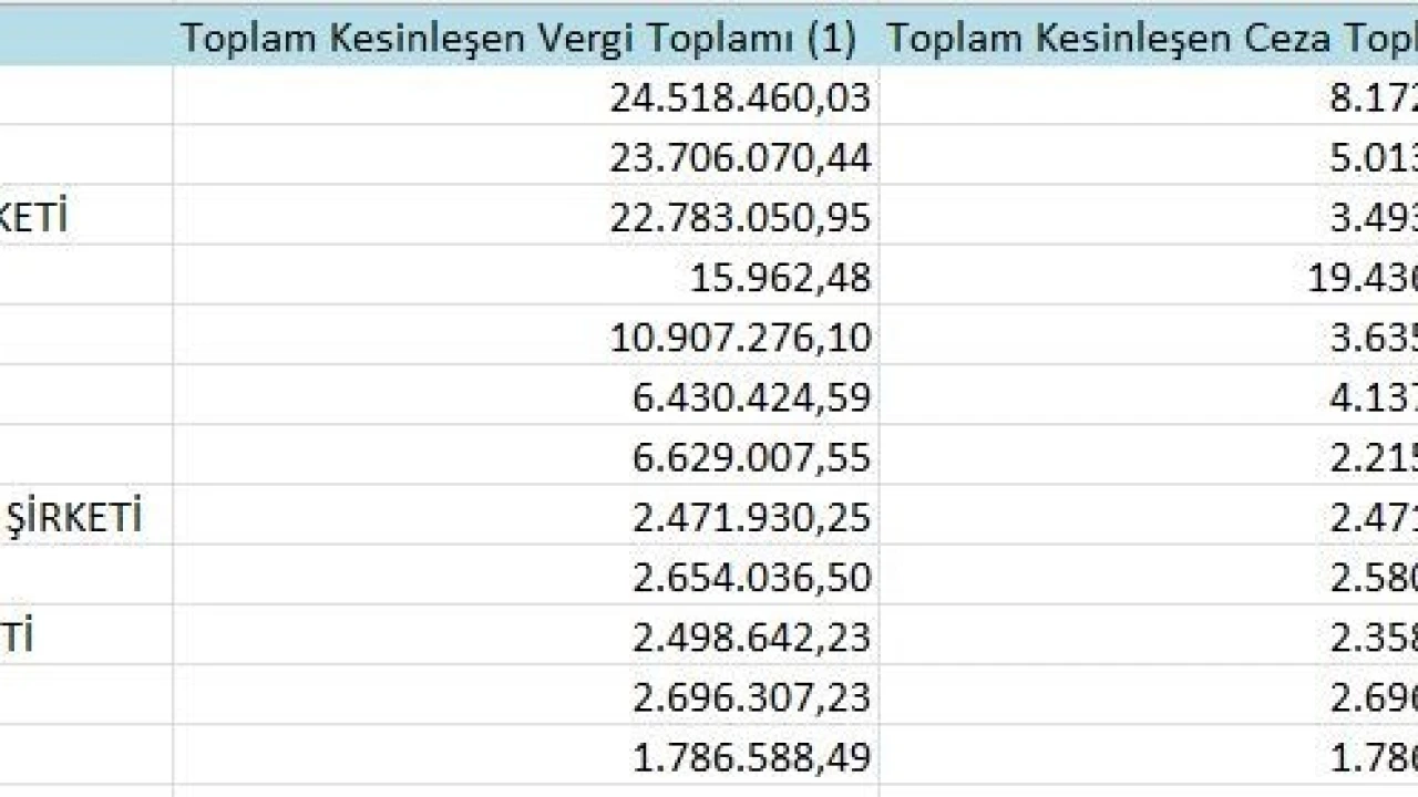 İkmalen, re’sen veya idarece yapılan tarhiyatlar nedeniyle kesinleşen ve toplam tutarı 5 milyon TL ve üzerinde olan vergi ve cezaları içeren A listesinde toplam 207 milyon 962 bin 915 TL ile 12 şirket kendine yer buldu.