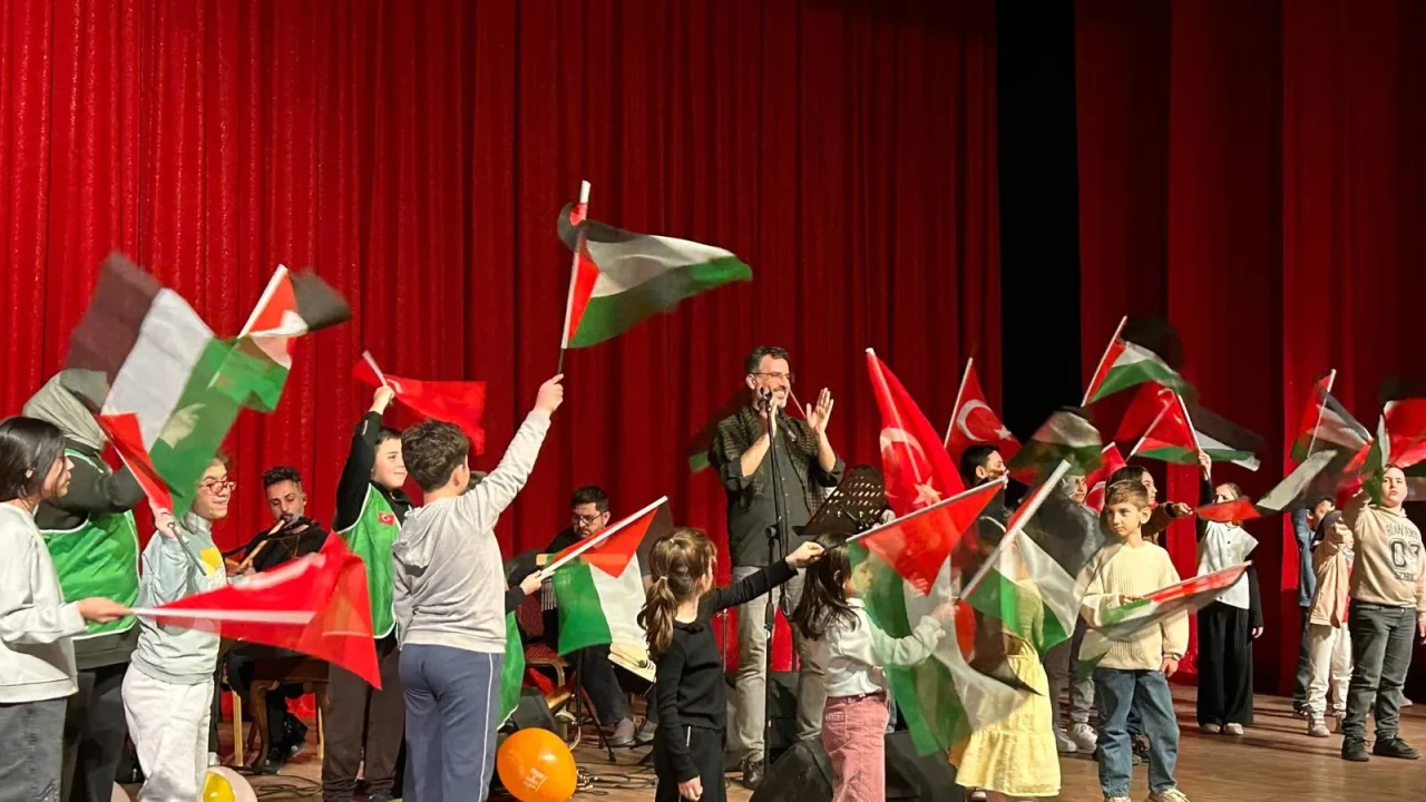 Programın en unutulmaz anlarından biri ise çocukların sahneye çıkarak ellerinde Filistin ve Türkiye bayraklarıyla ezgilere eşlik etmesi oldu. Salonda sık sık tekbirler yükselirken, birlik ve beraberlik mesajları verildi.