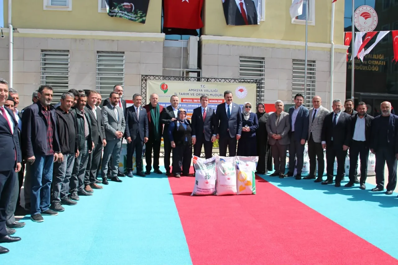 Amasya Valisi Önder Bakan, “Bugün de Ayçiçeği, Nohut ve Sorgum Sudan Otu Üretimini Geliştirme Projeleri kapsamında, 24 bin 913 dekar alanda ekimi yapılmak üzere, toplam bedeli 12 milyon TL olan 55 bin 740 kg tohumu, 1279 çiftçimize teslim edeceğiz” diye belirtti.