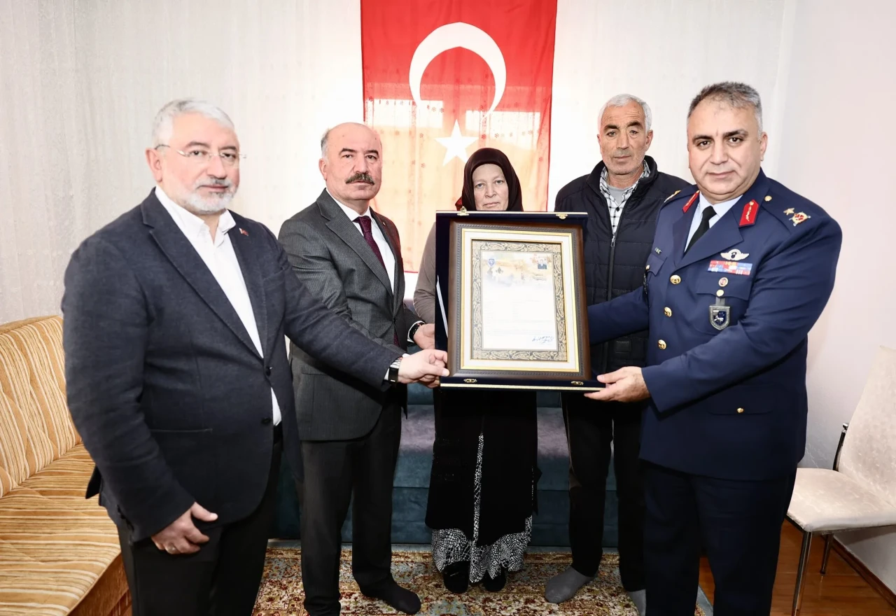 Ziyarette duygu dolu anlar yaşanırken, şehit Burak İbbiği’nin fedakârlığı ve vatan sevgisi bir kez daha rahmetle anıldı. Heyet, aileyi yalnız bırakmayarak hem manevi destek verdi hem de devletin şehit ailelerine gösterdiği güçlü bağlılığı vurguladı. Ziyaretin en anlamlı bölümü ise şehidimizin ailesine “Şahadet Belgesi”nin takdim edilmesi oldu. Şahadet Belgesi, Merzifon 5. Ana Jet Üs Komutanı Tuğgeneral Halil Uğur Serin ve Vali Ali Çalgan tarafından şehidin ailesine teslim edildi.