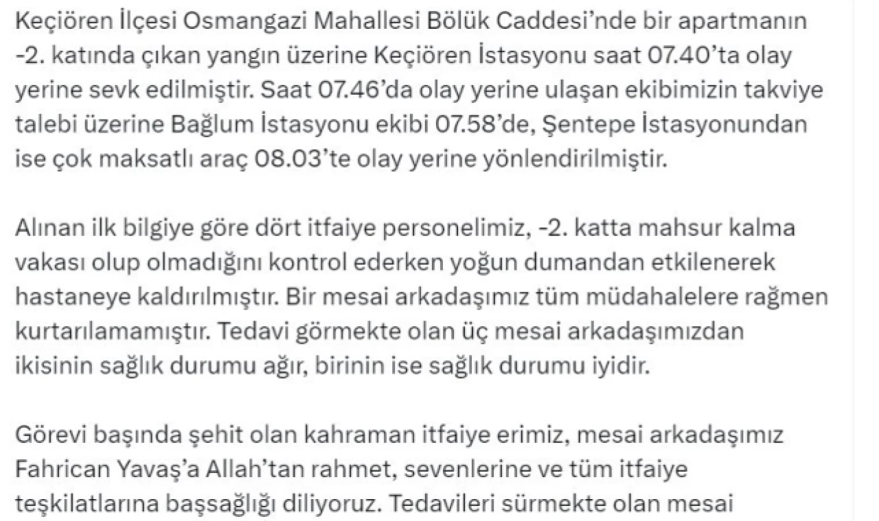 Keçiören ilçesi Osmangazi Mahallesi Bölük Caddesi'nde bir apartmanın bodrumunda eksi 2. katında saat 07.40'ta yangın çıktı. Yangının ardından olay yerine çok sayıda itfaiye ekibi sevk edildi. Ankara Büyükşehir Belediyesi'nden yapılan açıklamaya göre, yoğun dumandan etkilenen itfaiye eri Fahrican Yavaş şehit oldu. Dumandan etkilenen 3 itfaiye erinin 2'sinin durumunun ağır, 1'nin ise sağlık durumunun iyi olduğu belirtildi.