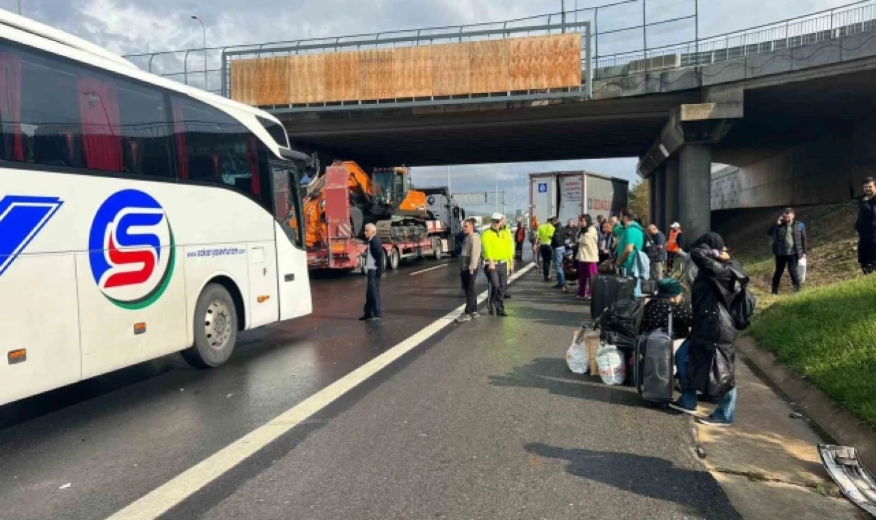 Anadolu TEM Otoyolu'nda zincirleme kaza meydana geldi. Kazada kamyon sürücüsü hafif yaralanırken kazaya karışan otobüsün içerisindeki yolcular ise valizleriyle yolda kaldı.