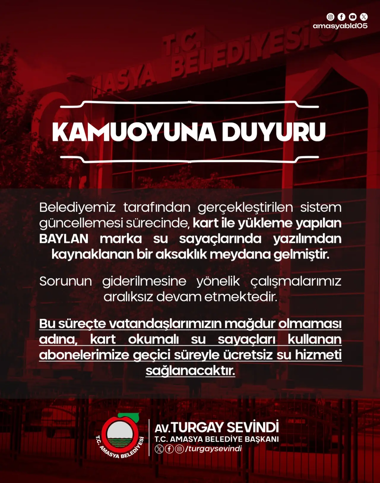 Kamuoyuna yapılan duyuruda, söz konusu aksaklığın giderilmesi için ekiplerin yoğun şekilde çalıştığı belirtilirken, vatandaşların mağduriyet yaşamaması adına dikkat çeken bir karar alındı. Amasya Belediye Başkanı Turgay Sevindi, sorun çözülene kadar kartlı sayaç kullanan abonelere geçici süreyle ücretsiz su hizmeti sağlanacağını açıkladı.