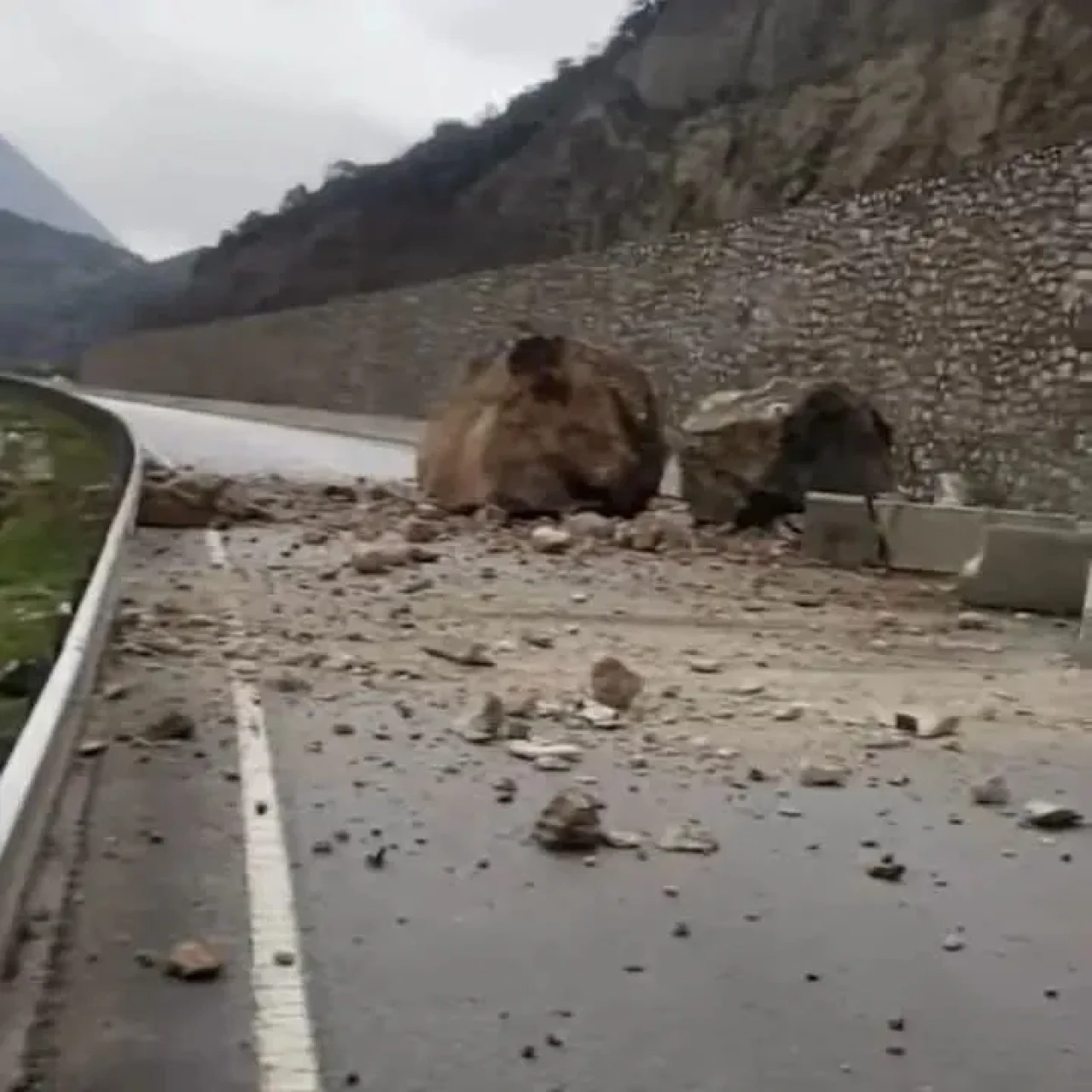 Amasya’da dağdan kopan dev kaya parçaları yola düştü. Olay sırasında yolda araç ya da yaya bulunmaması muhtemel bir faciayı önledi.