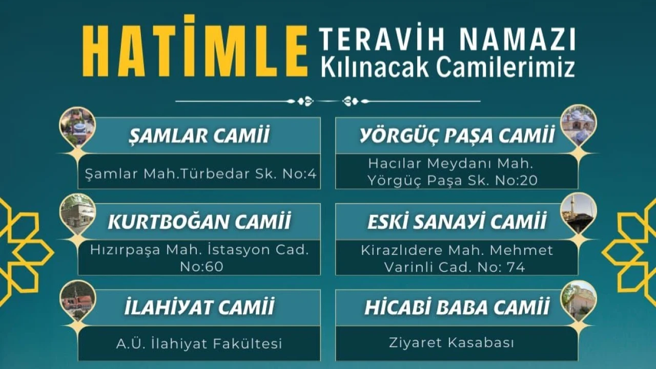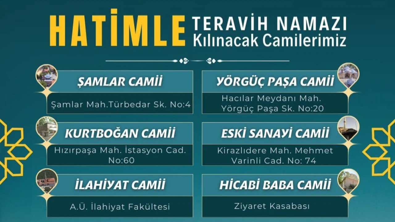 Amasya’nın çeşitli yerlerinde bulunan altı camide düzenlenecek olan hatimli Teravih namazları, vatandaşlara Ramazan ayının ruhunu doyasıya yaşama fırsatı sunuyor. Şamlar Camii’nde başlayacak olan tilavet programı, diğer camilerde de aynı disiplin ve düzen içerisinde devam edecek. Yörgüç Paşa Camii, Kurtboğan Camii, Eski Sanayi Camii, İlahiyat Camii ve Hicabi Baba Camii’nde de her akşam aynı şekilde gerçekleştirilecek olan namaz, özellikle genç neslin Kur’an sevgisini pekiştirmesi ve dini değerlerin doğru aktarılması açısından önemli bir adım olarak öne çıkıyor.