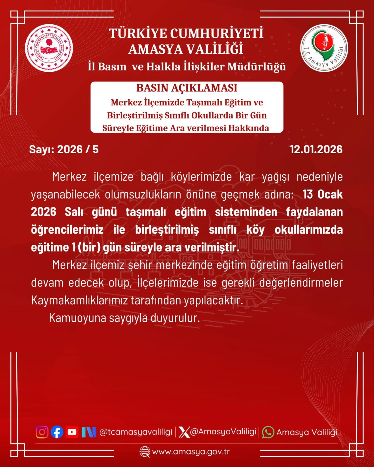 Amasya Valiliği, etkili olan kar yağışı ve buna bağlı olarak yaşanabilecek olumsuzluklara karşı aldığı tedbirleri kamuoyuyla paylaştı. İl Basın ve Halkla İlişkiler Müdürlüğü tarafından yapılan resmi açıklamaya göre, Amasya Merkez ilçeye bağlı köylerde taşımalı eğitim kapsamında öğrenim gören öğrenciler ile birleştirilmiş sınıflı köy okullarında eğitim öğretime 13 Ocak 2026 Salı günü için bir gün süreyle ara verildi.