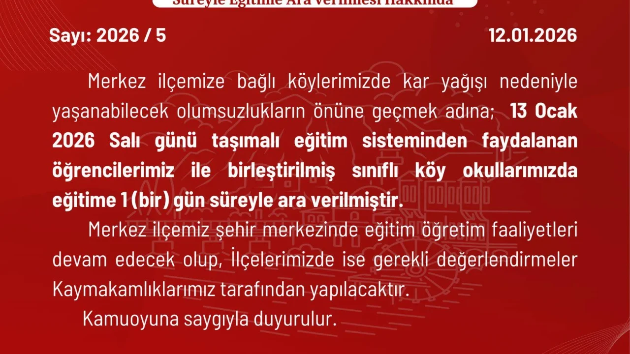 Valilikten yapılan duyuruda, özellikle kırsal bölgelerde kar yağışının ulaşımda ve öğrenci güvenliğinde risk oluşturabileceğine dikkat çekildi. Öğrencilerin okullara güvenli şekilde ulaşmasının öncelik olduğu vurgulanırken, olası mağduriyetlerin önüne geçmek amacıyla bu kararın alındığı ifade edildi. Kar yağışının yoğunluğu ve hava koşullarının seyri dikkate alınarak yapılan değerlendirme sonucunda, taşımalı sistemle okula giden öğrencilerin ve birleştirilmiş sınıflı köy okullarındaki eğitim faaliyetlerinin geçici olarak durdurulmasının uygun görüldüğü bildirildi.