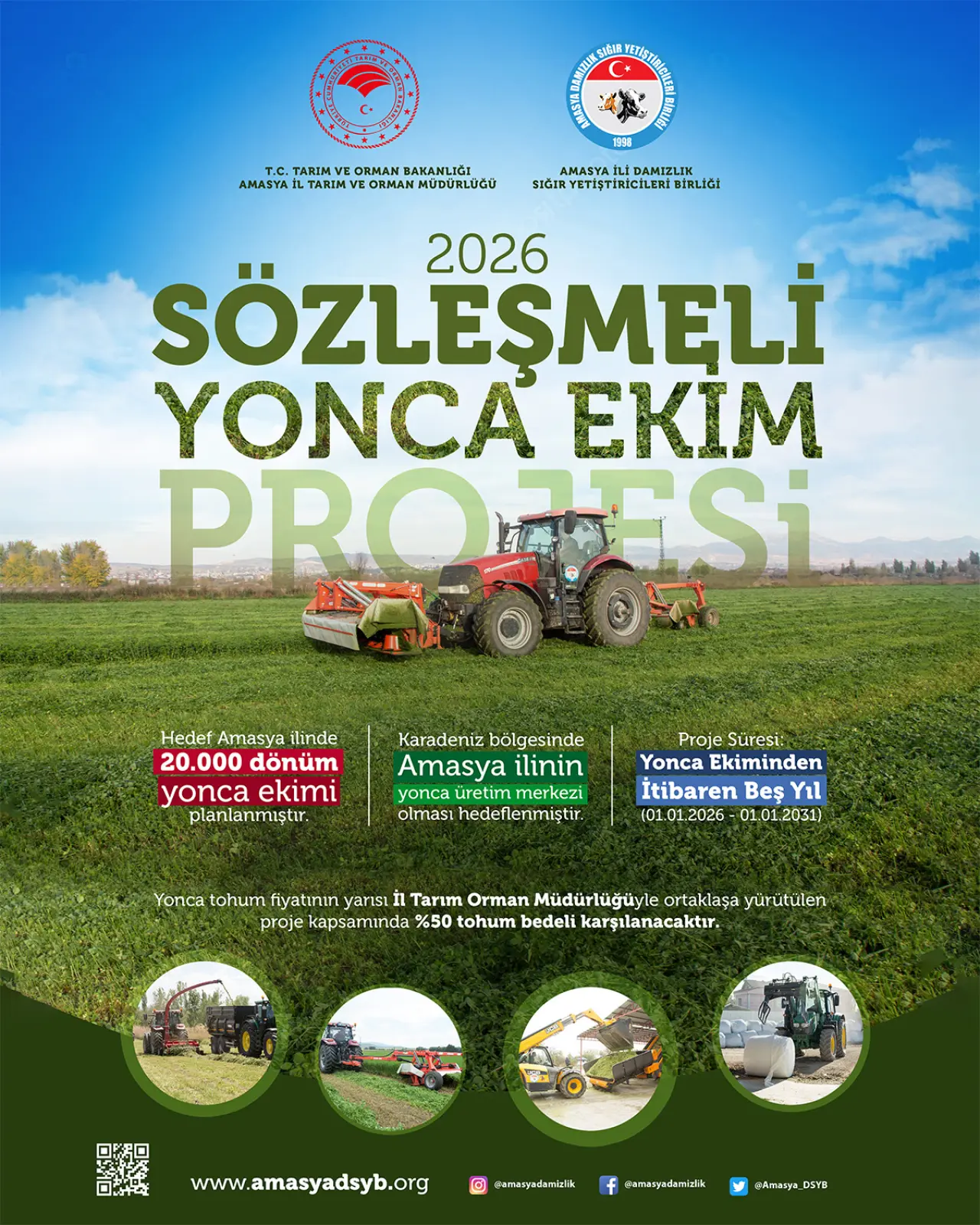 Merkezi Merzifon’da bulunan Amasya İli Damızlık Sığır Yetiştiricileri Birliği, hayvancılık sektörünü desteklemek ve yem maliyetlerini azaltmak amacıyla önemli bir projeyi hayata geçirdi. T.C. Tarım ve Orman Bakanlığı ile Amasya İli Damızlık Sığır Yetiştiricileri Birliği iş birliğinde hazırlanan Sözleşmeli Yonca Ekim Projesi, 2026 yılı itibarıyla uygulanmaya başlanacak.