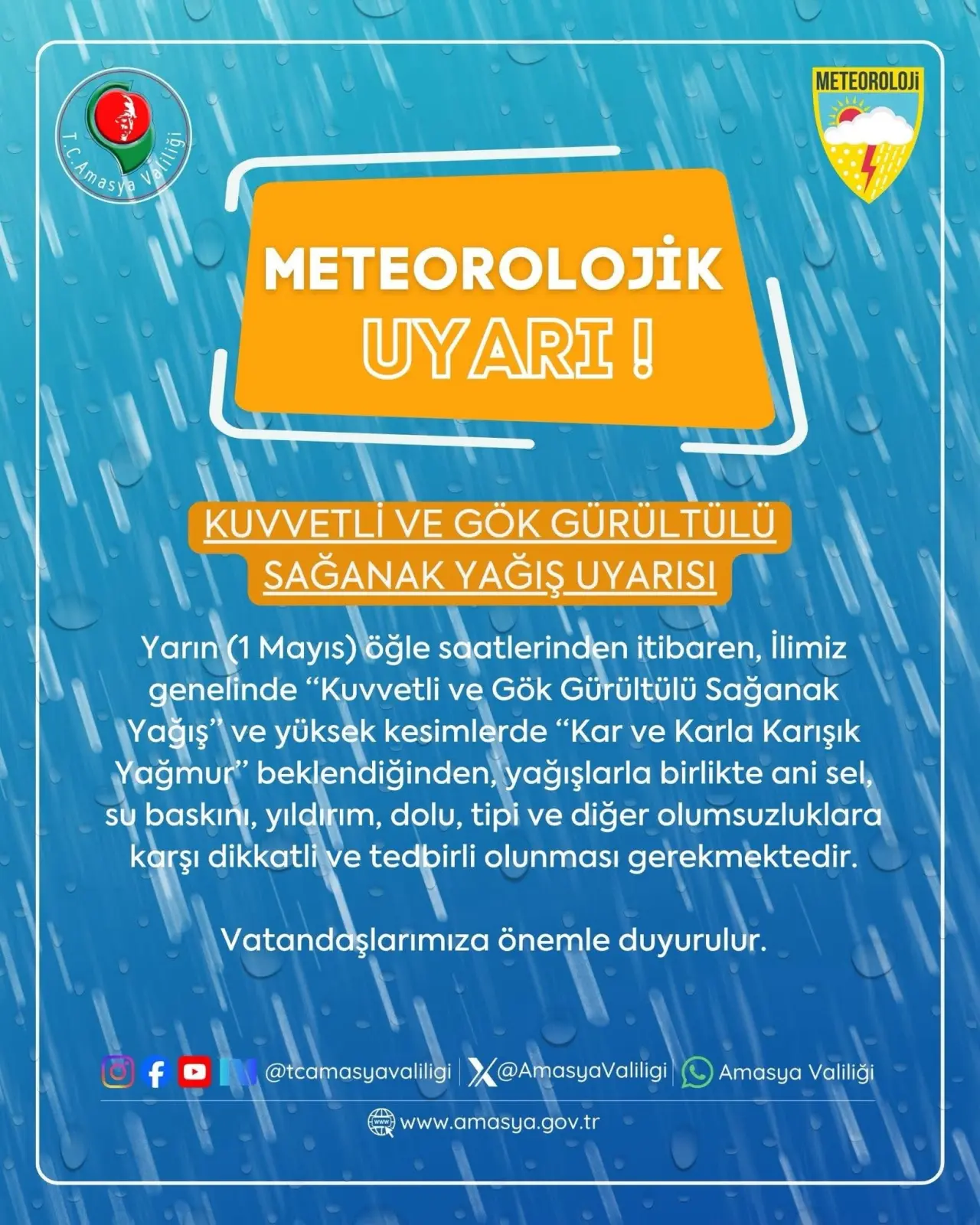 Amasya Valiliği tarafından yapılan meteorolojik uyarıya göre, 1 Mayıs itibarıyla il genelinde etkili olması beklenen kuvvetli yağışlara karşı vatandaşların dikkatli olması istendi.