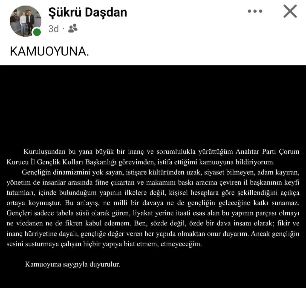 Bir diğer istifa ise, Kurucu Gençlik Kolları Başkanı Şükrü Daşdan’dan geldi. Daşdan da istifa gerekçesinde gençlere sadece tabela süsü olarak gören bir anlayışa, gençliğin sesini susturmaya çalışan hiçbir yapıya biat etmeyeceğini belirterek, il başkanına yönelik eleştirilerde bulundu.