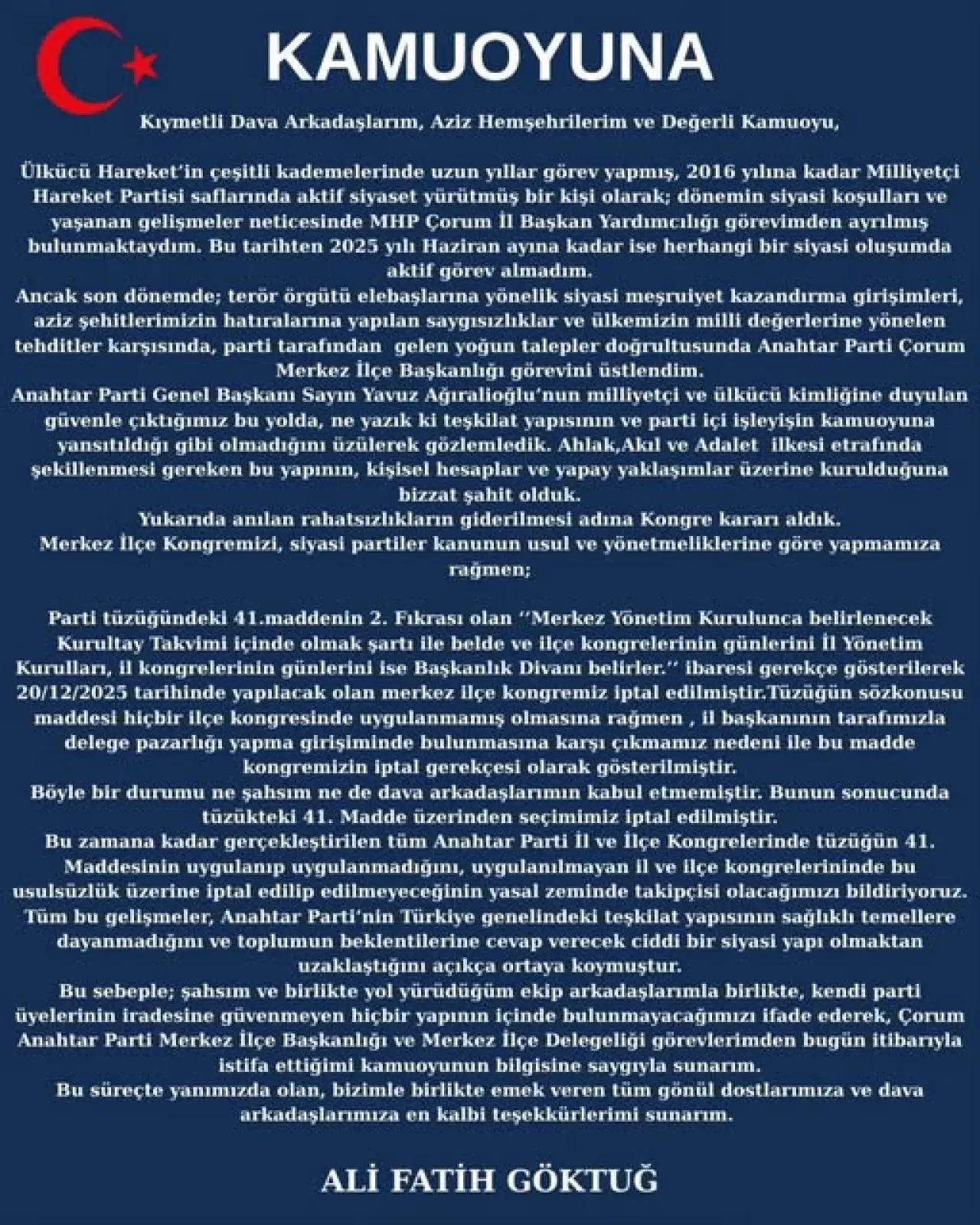 Parti genel merkezi ve İl Başkanı Nurullah Müstet’in tutum ve davranışlarını da istifasında gerekçe olarak gösteren Ali Fatih Göktuğ, kendisine görev süresince inanan ve güvenen tüm dava arkadaşlarına da teşekkür etti.