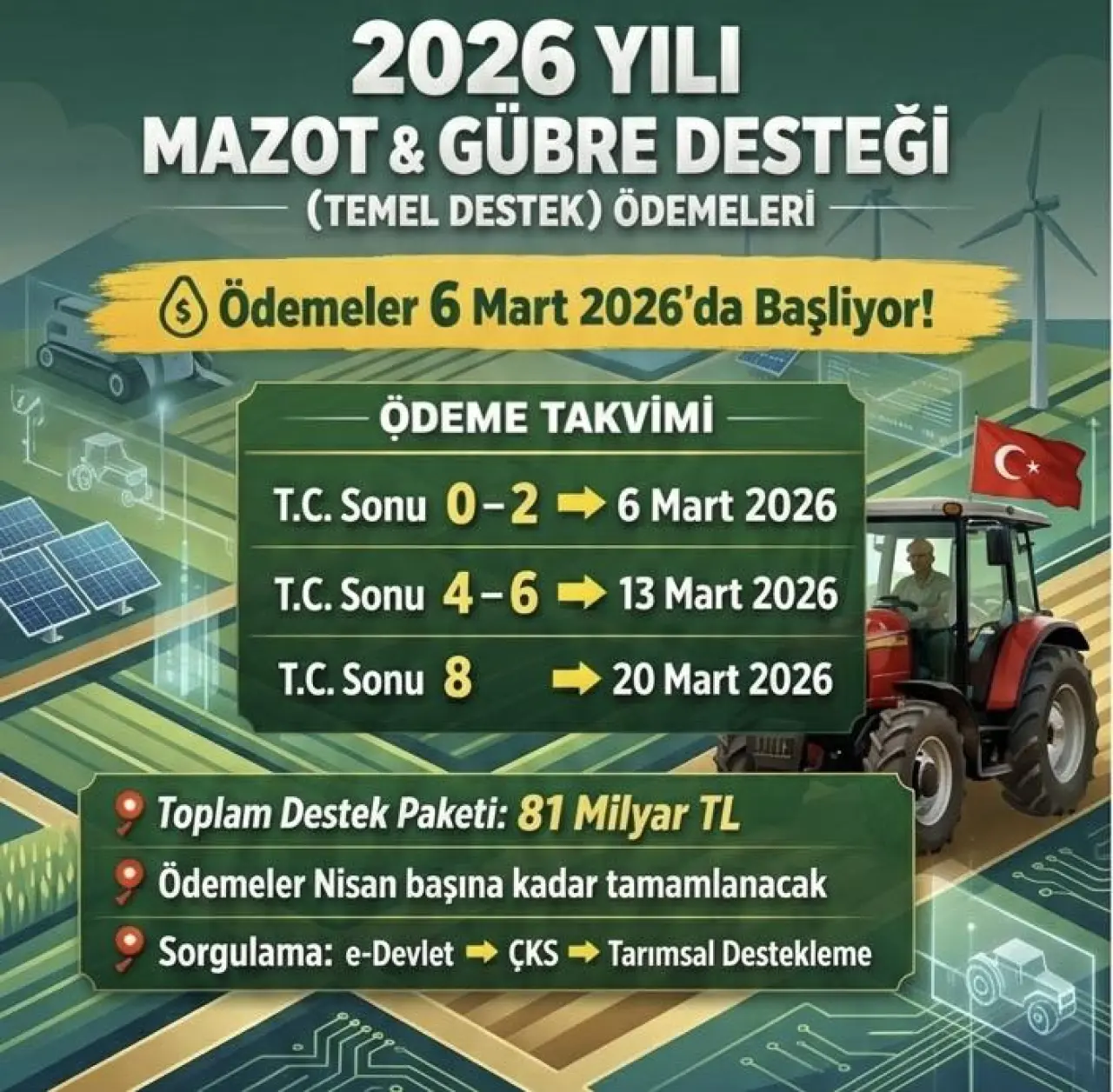 T.C. kimlik numarasının sonu 8 olan üreticilere ise ödemeler 20 Mart 2026 tarihinde yapılacak.