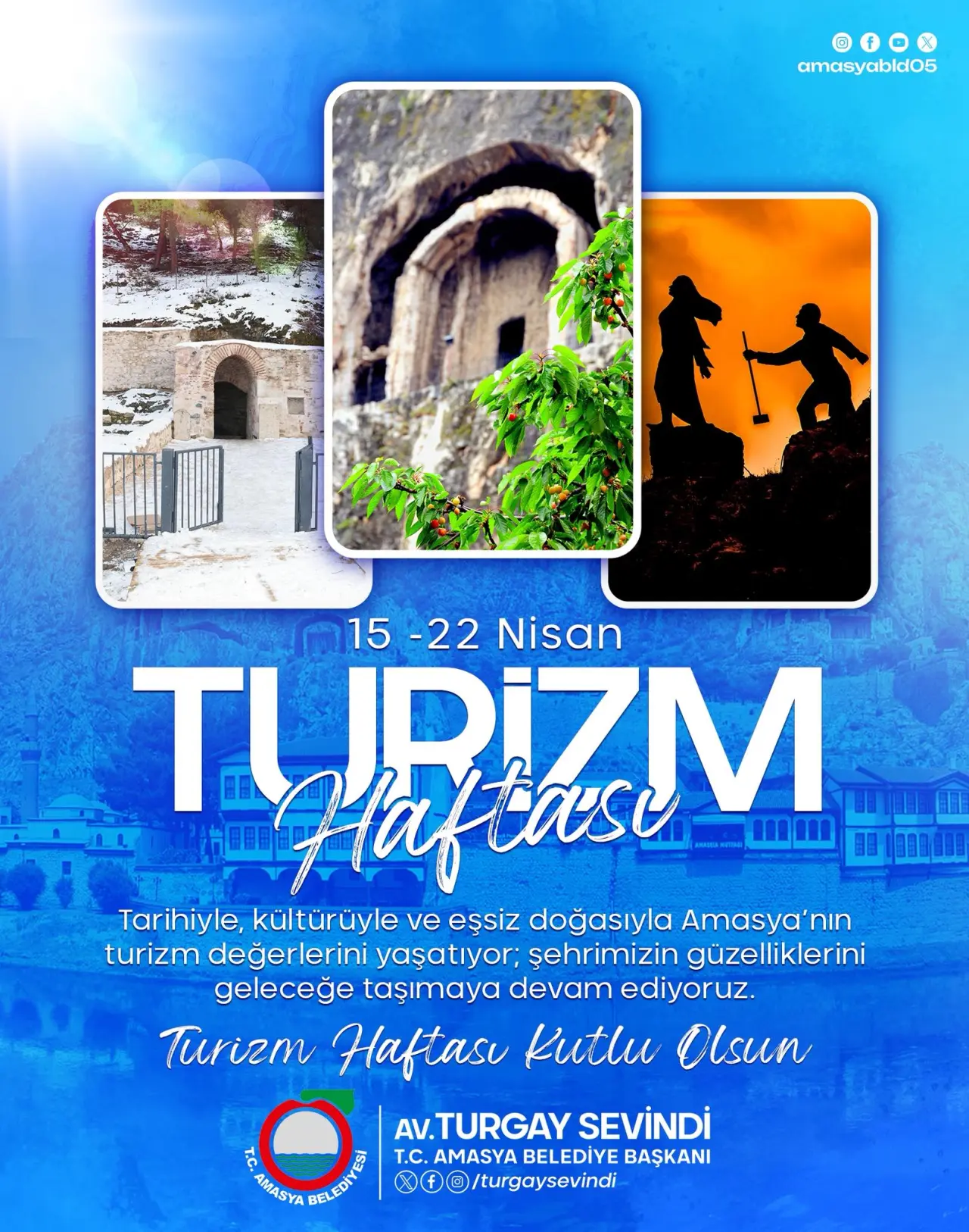Amasya Belediye Başkanı Turgay Sevindi, 15–22 Nisan Turizm Haftası dolayısıyla yaptığı açıklamada, kentin sahip olduğu tarihi, doğal ve kültürel zenginliklerin korunarak gelecek nesillere aktarılmasının büyük önem taşıdığını vurguladı. Sevindi, Amasya’nın turizmde hak ettiği noktaya ulaşması için çalışmaların kararlılıkla sürdürüldüğünü ifade etti.