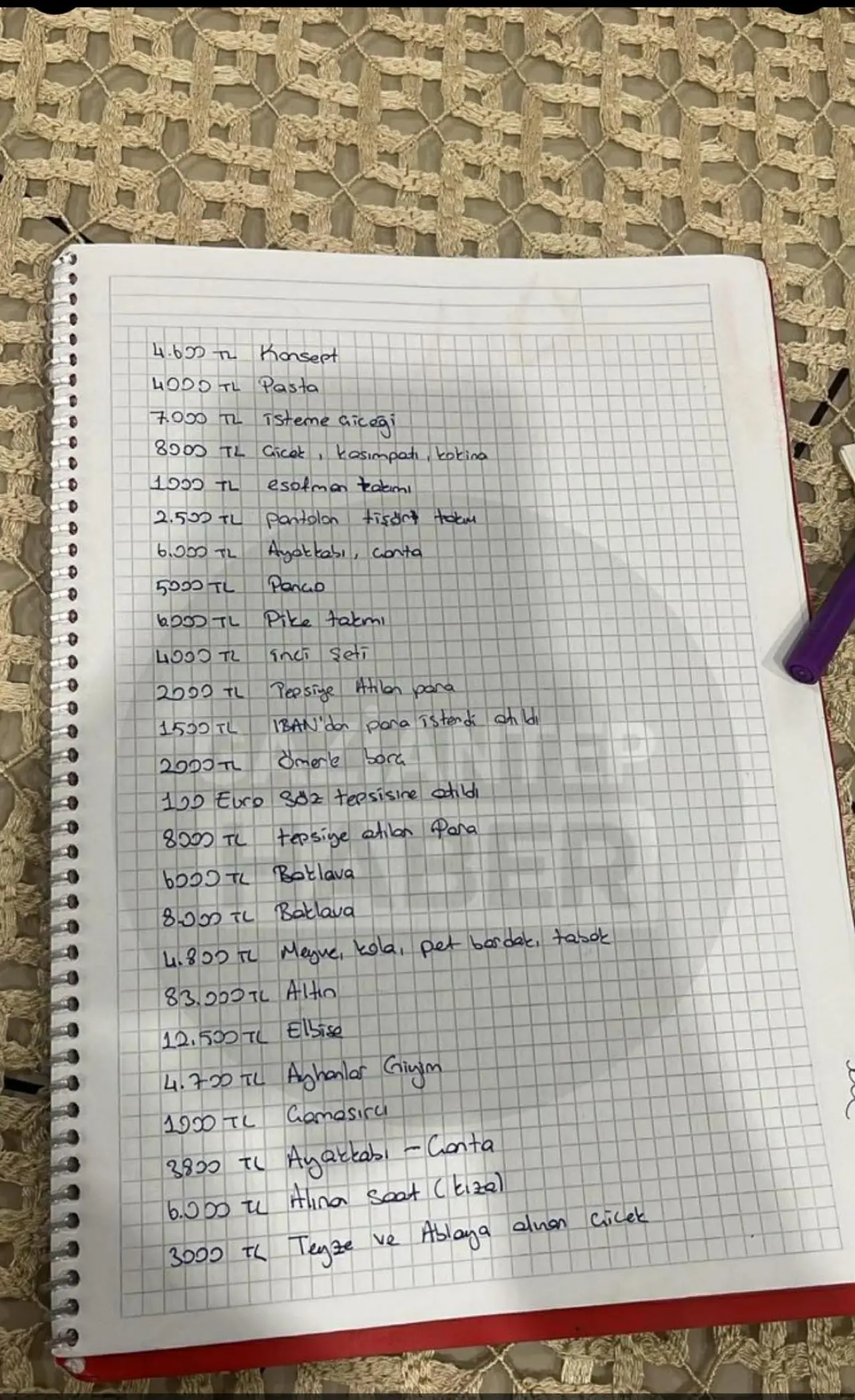 Erkek tarafı tarafından tutulduğu öne sürülen listede; nişan organizasyonu, altın, kıyafet, ayakkabı, çanta, çikolata, baklava, çiçek, bohça masrafları ve çeşitli nakit ödemeler yer aldı. Deftere yazılan kalemlerin toplamının yaklaşık 200 bin TL’yi bulduğu belirtildi.