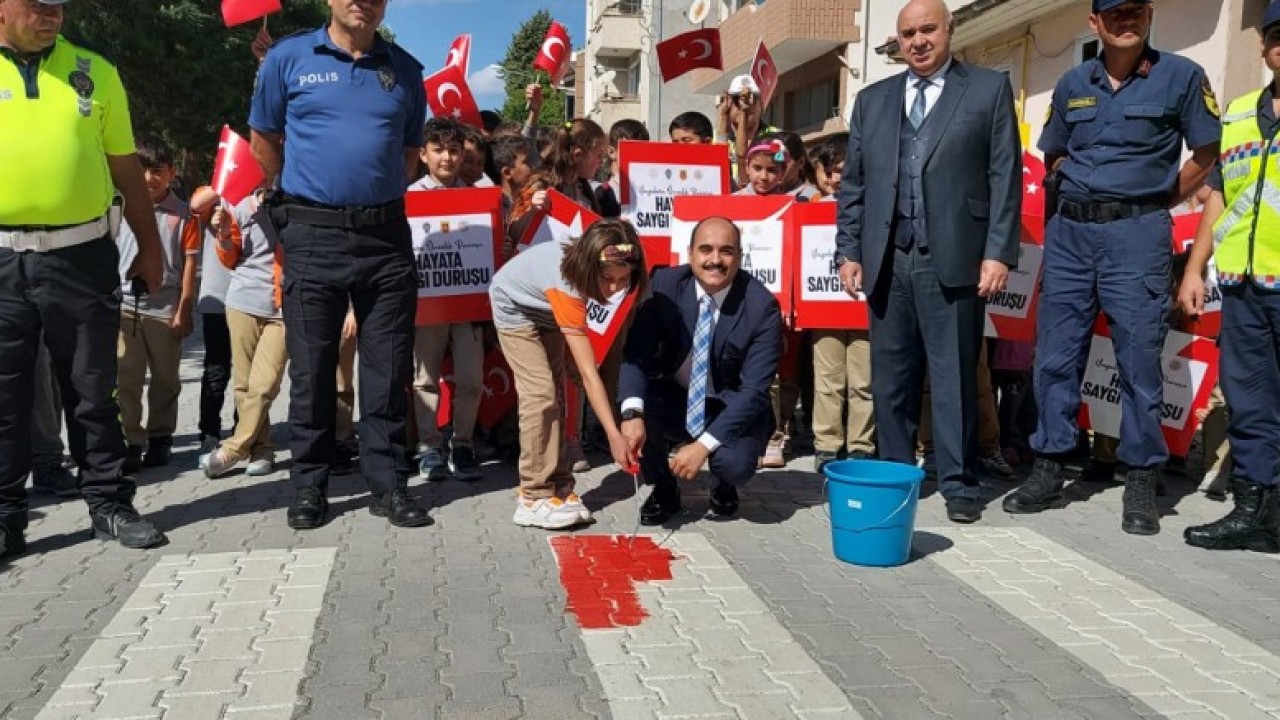Kaymakam Altınöz, öncelikli olarak sürücülere yaya geçitlerinde ilk geçiş hakkının yayanın olduğu vurgusunu yaparak yaya çizgilerinin bir tanesini sembolik olarak kırmızıya boyadı. Öğrenciler ise ellerindeki “Yayalara Öncelik Duruşu, Hayata Saygı Duruşu” pankartlar ve bayraklar ile dikkat çekti.