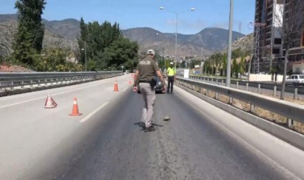 Kaplumbağanın yanına giden ekipler, trafiği durdurdu. Komiser Aykut Yerevur, kaplumbağayı eliyle alıp yol kenarına bıraktı.