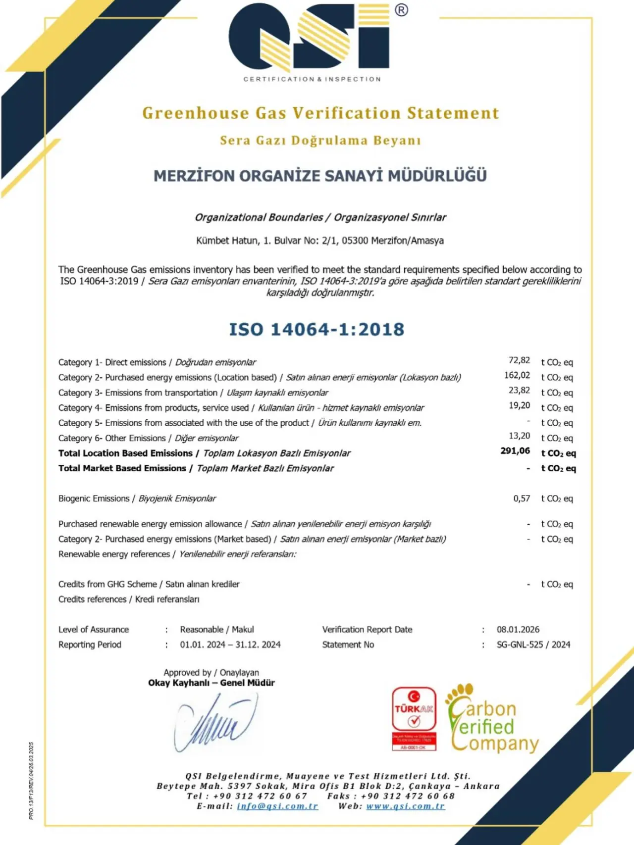 Hazırlanan rapor ve doğrulama süreci, ISO 14064 standartları çerçevesinde gerçekleştirildi. Sera gazı emisyonlarının kategorilere ayrılarak incelendiği çalışmada, doğrudan ve dolaylı emisyon kaynakları detaylı şekilde değerlendirildi. Böylece Merzifon OSB’nin mevcut çevresel performansı net verilerle ortaya konuldu.