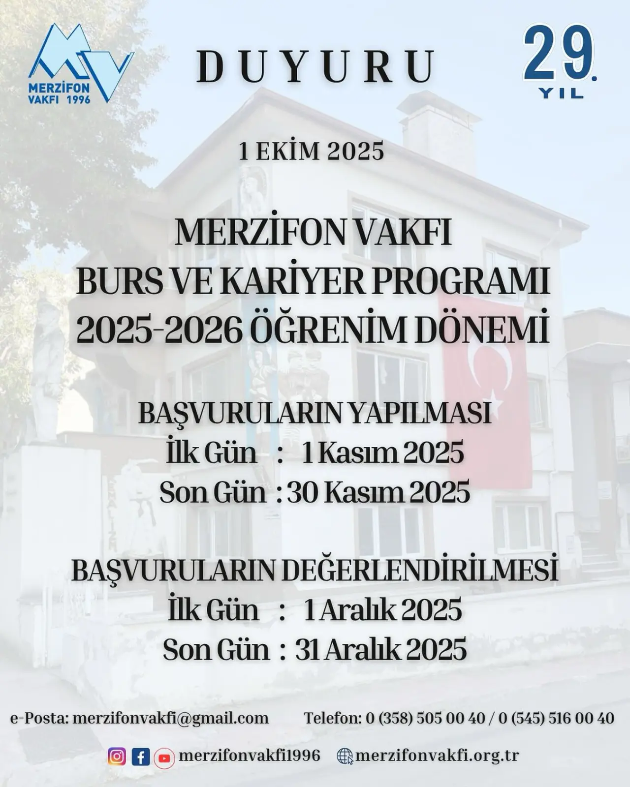 Başvurular, Merzifon Vakfı’nın resmi internet sitesi üzerinden online olarak yapılabilecek. Öğrenciler ayrıca gerekli bilgilere vakfın sosyal medya hesapları ve iletişim kanallarından ulaşabilecek.
