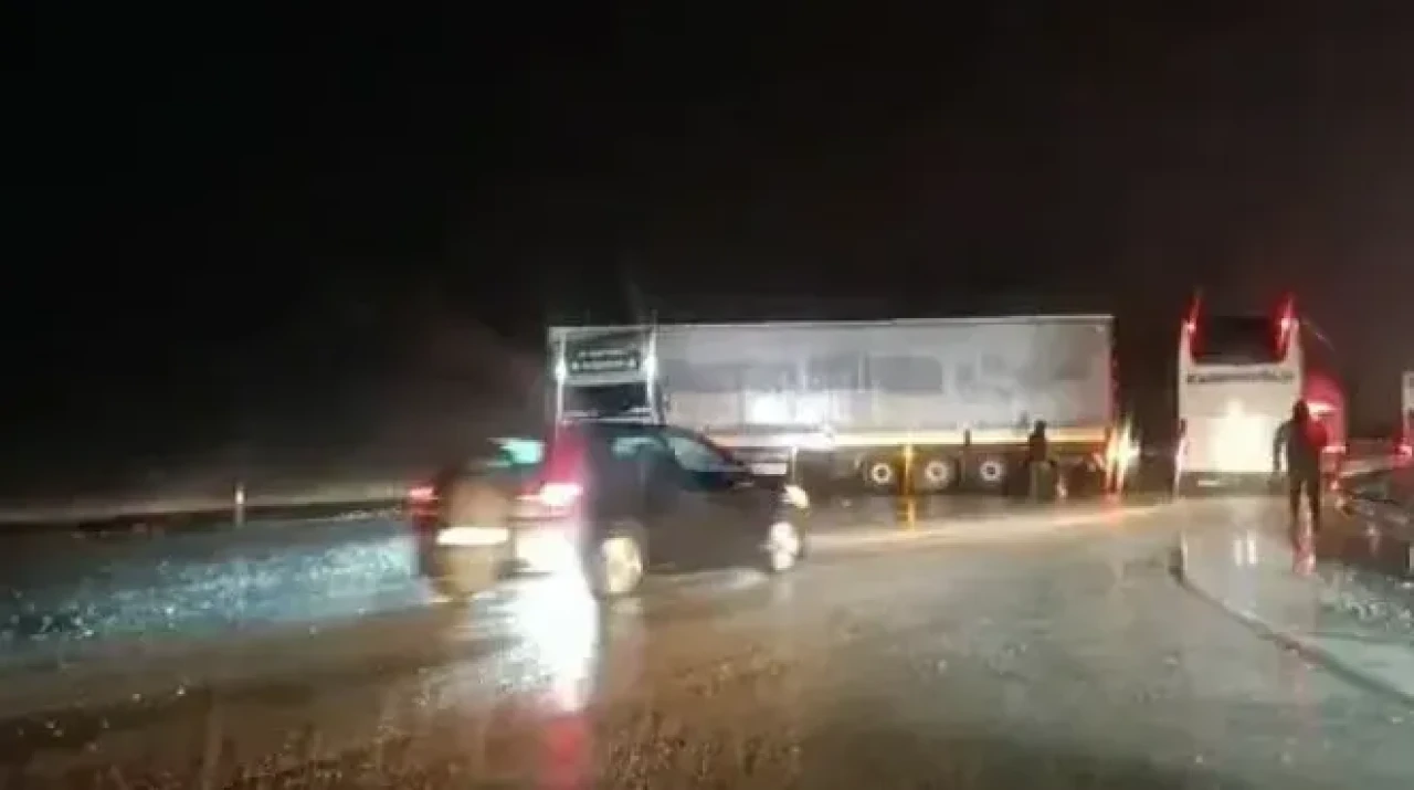 Yoğun yağış nedeniyle yan dönen tır yolun karşı şeridini de kapatırken, ulaşım bir süre kontrollü olarak devam etti.