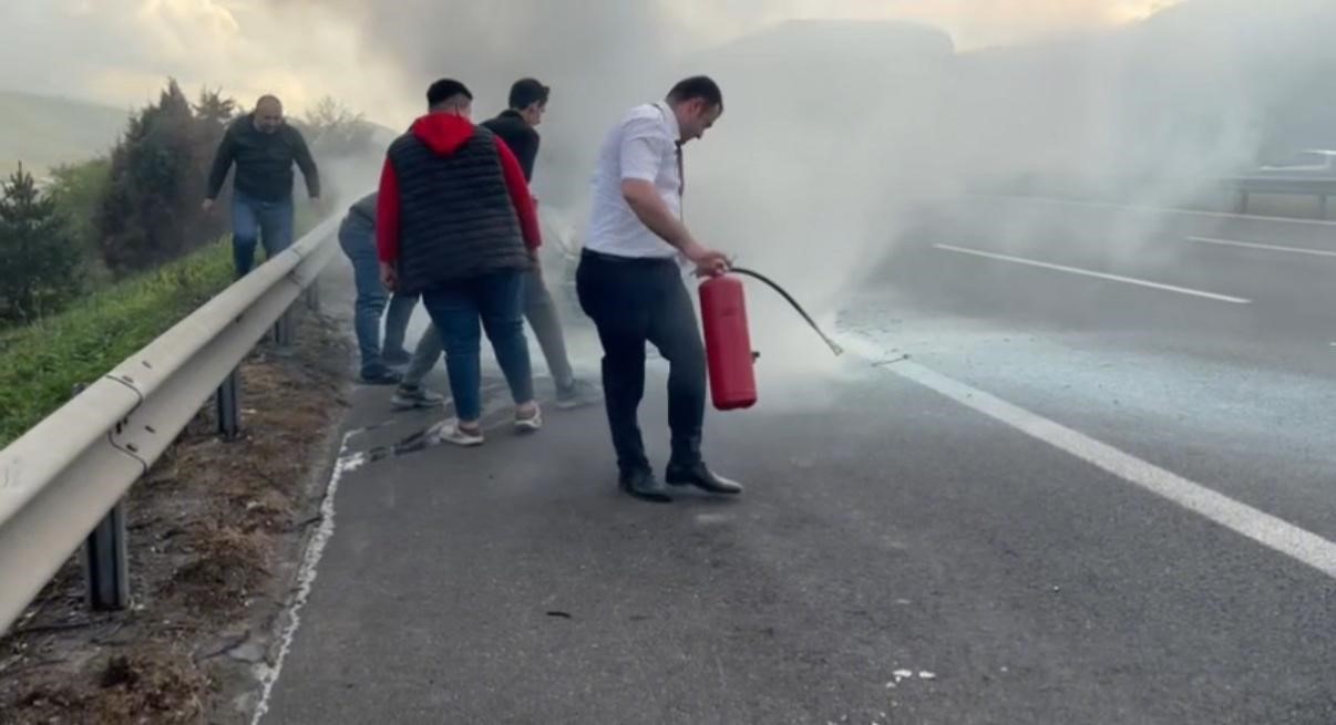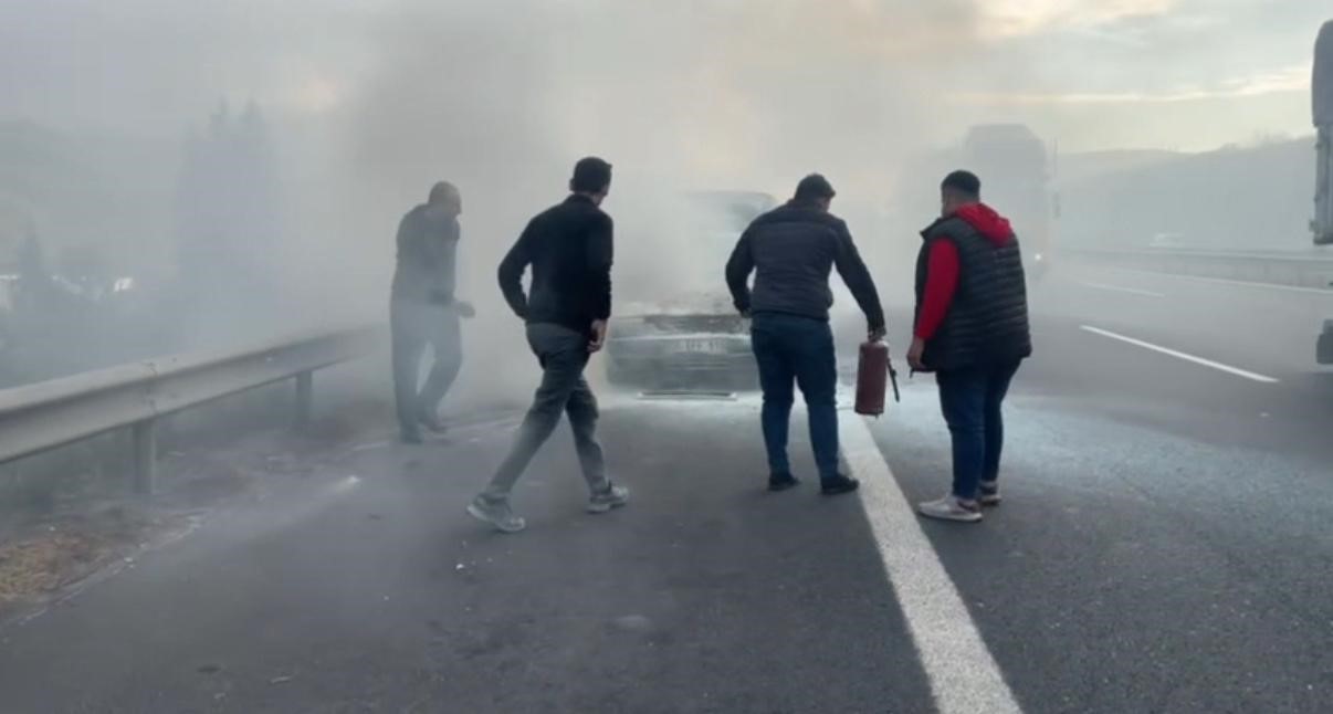 Anadolu Otoyolu’nda motor kısmından alev alan otomobildeki yangını, diğer sürücüler ve jandarma ekipleri söndürdü.