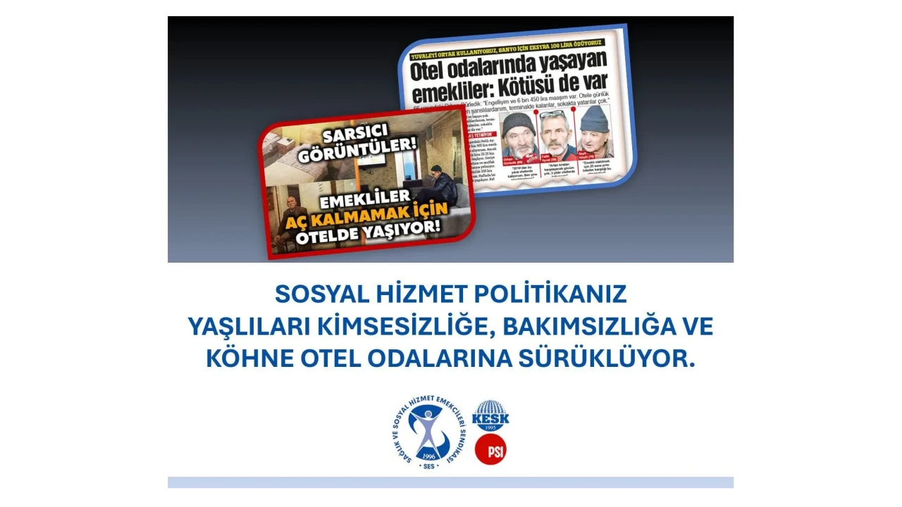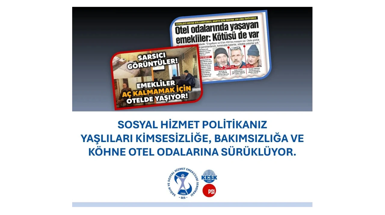Sosyal Hizmet politikasının yaşlıları kimsesizliğe, bakımsızlığa ve köhne otel odalarına sürüklediğini ifade eden Sağlık ve Sosyal Hizmet Emekçileri Sendikası Amasya İl Başkanı Satılmış Ayan, “ Bakanlık tarafından 2021 yılında yapılan Gerontolojik Bakım ve Bakış Perspektifinden 1. Uluslararası Yaşlı Bakım Çalıştayında; “Yaşlılarda yalnızlaşmayı önlemek ve üretkenliklerini yani işlevliğini arttırmak gerekmektedir. Nesiller arası dayanışma yaşlıların yalnız olmadıklarını hissetmelerini sağlamaktadır. Yani kuşaklararası dayanışmaya önem vermemiz gerekmektedir. Bunu bir bakanlık vizyonu olarak ortaya koymaktayız.