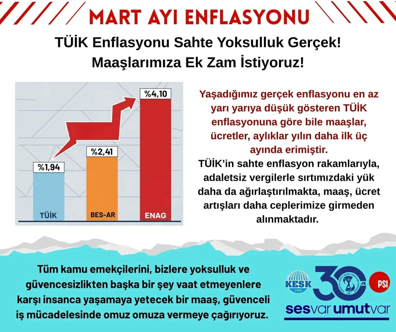 “TÜİK, iğneden ipliğe zam fırtınasının sürdüğü koşullarda enflasyonun Mart ayında sadece %1,94 arttığını, yıllık enflasyonun ise %30,87 olduğunu açıklamıştır. Öte yandan TÜİK kendi verileri bile sebze ve meyve fiyatlarında yıllık ortalama %80 artış yaşandığını göstermesine rağmen Mart ayı gıda enflasyonunu sadece %1,80 olarak açıklanmıştır.
