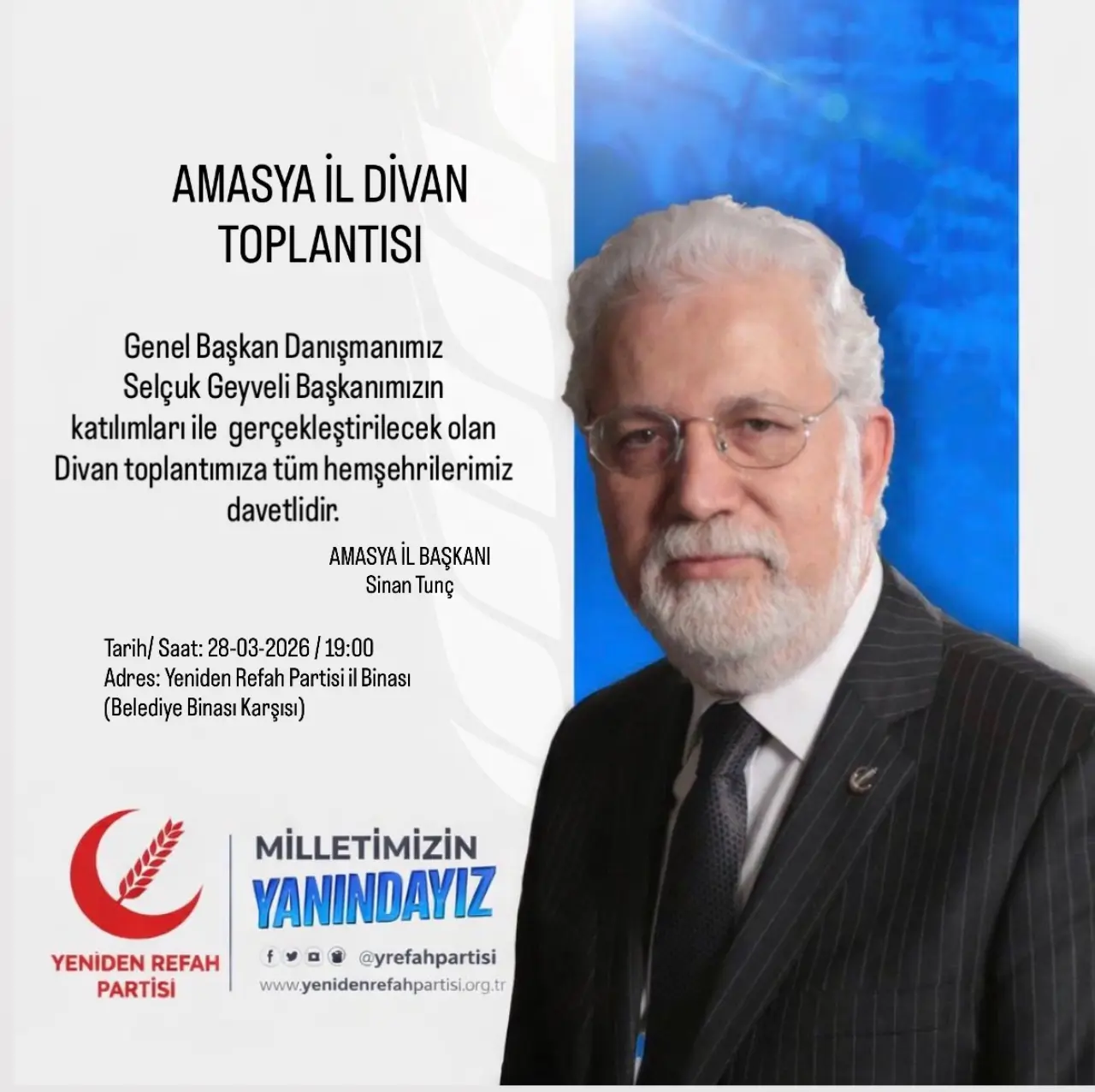 Yeniden Refah Partisi Amasya İl Başkanlığı, önemli bir organizasyona hazırlanıyor. İl Başkanı Sinan Tunç tarafından yapılan açıklamaya göre, Amasya İl Divan Toplantısı 28 Mart 2026 tarihinde gerçekleştirilecek.