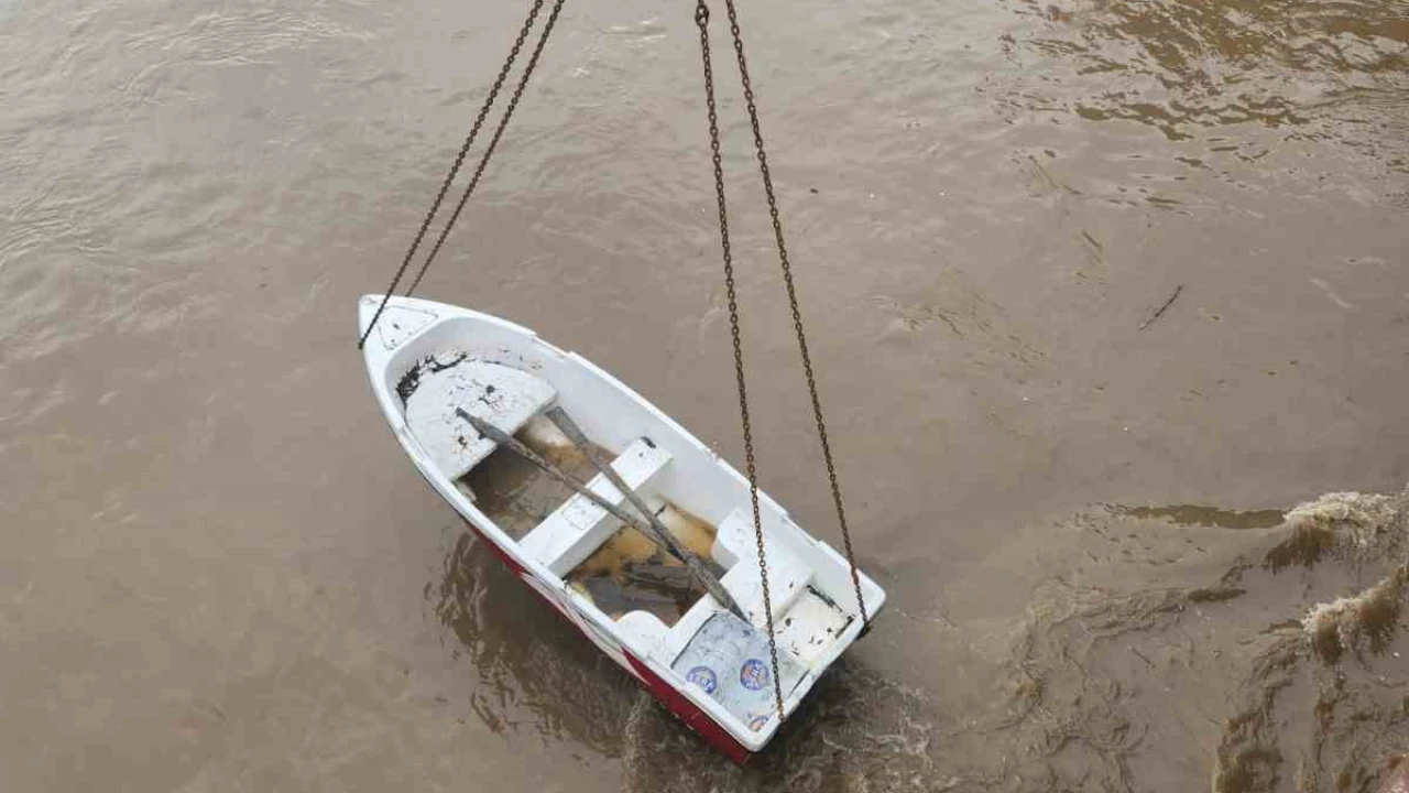 Amasya’da debisi yükselen Yeşilırmak Nehri’nde köprü ayağına takılan kayık vinç yardımıyla çıkartıldı.