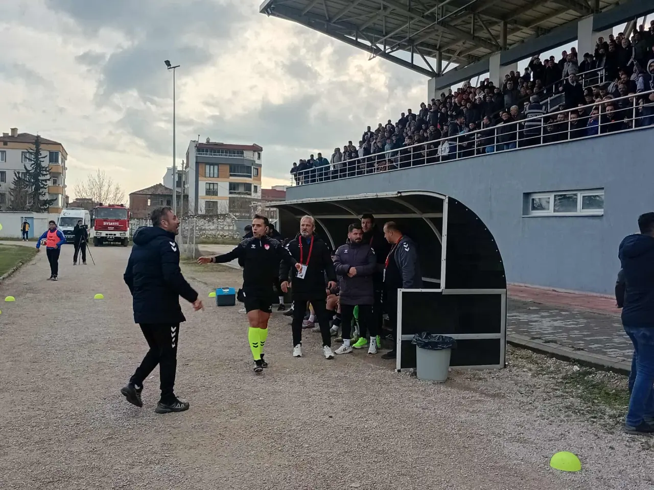 Tribünlere ve hakemlere yönelik sürekli sözlü tacizde bulunan Ladik Belediyespor Teknik Direktörü Eyüp Narşap maçın hakemi Emrullah Karslı tarafından sarı kartla cezalandırıldı.